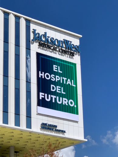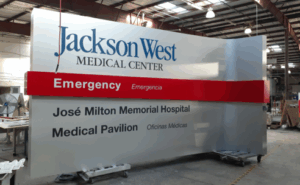 Creative Sign Designs was selected to partner with Yates Construction to fabricate and install the signage program for the brand-new 27-acre Jackson West Medical Center campus in Doral, Florida. This project includes the José Milton Memorial Hospital – a 100-bed all-private acute care hospital, parking garage, and medical office building.